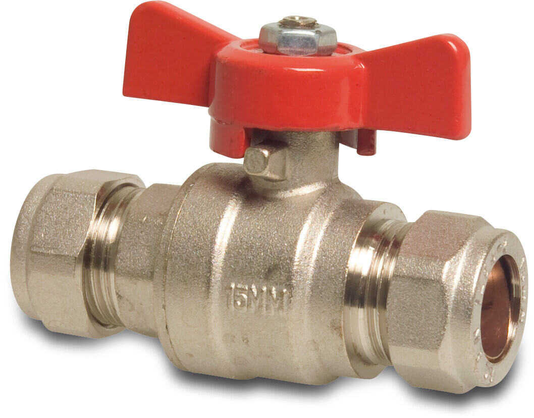 Dieses Ventil hat eine Pressverbindung mit einem Betriebsdruck bis 10 Bar. Der Schmetterlings-Griff erleichtert die Verwendung in engen Bereichen.